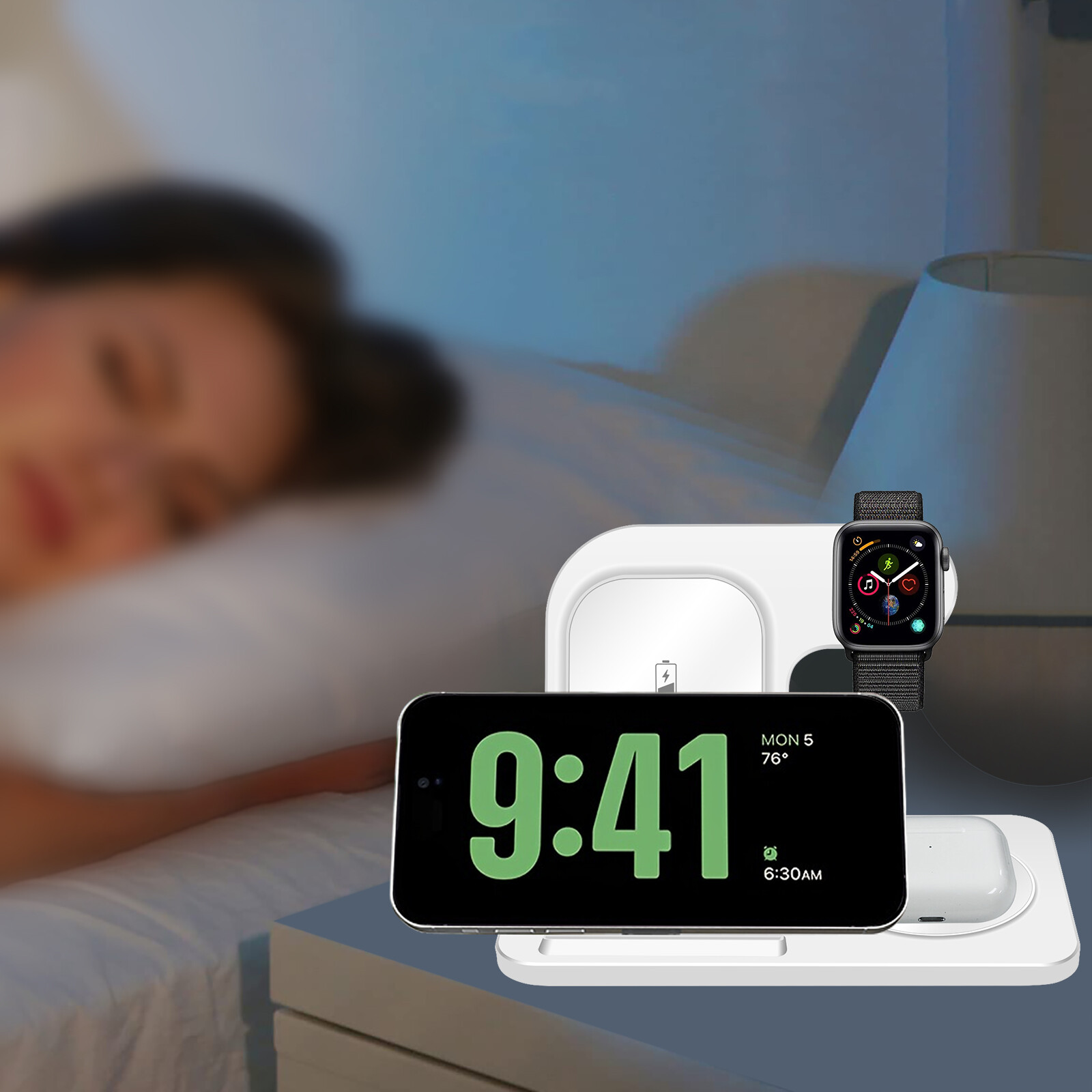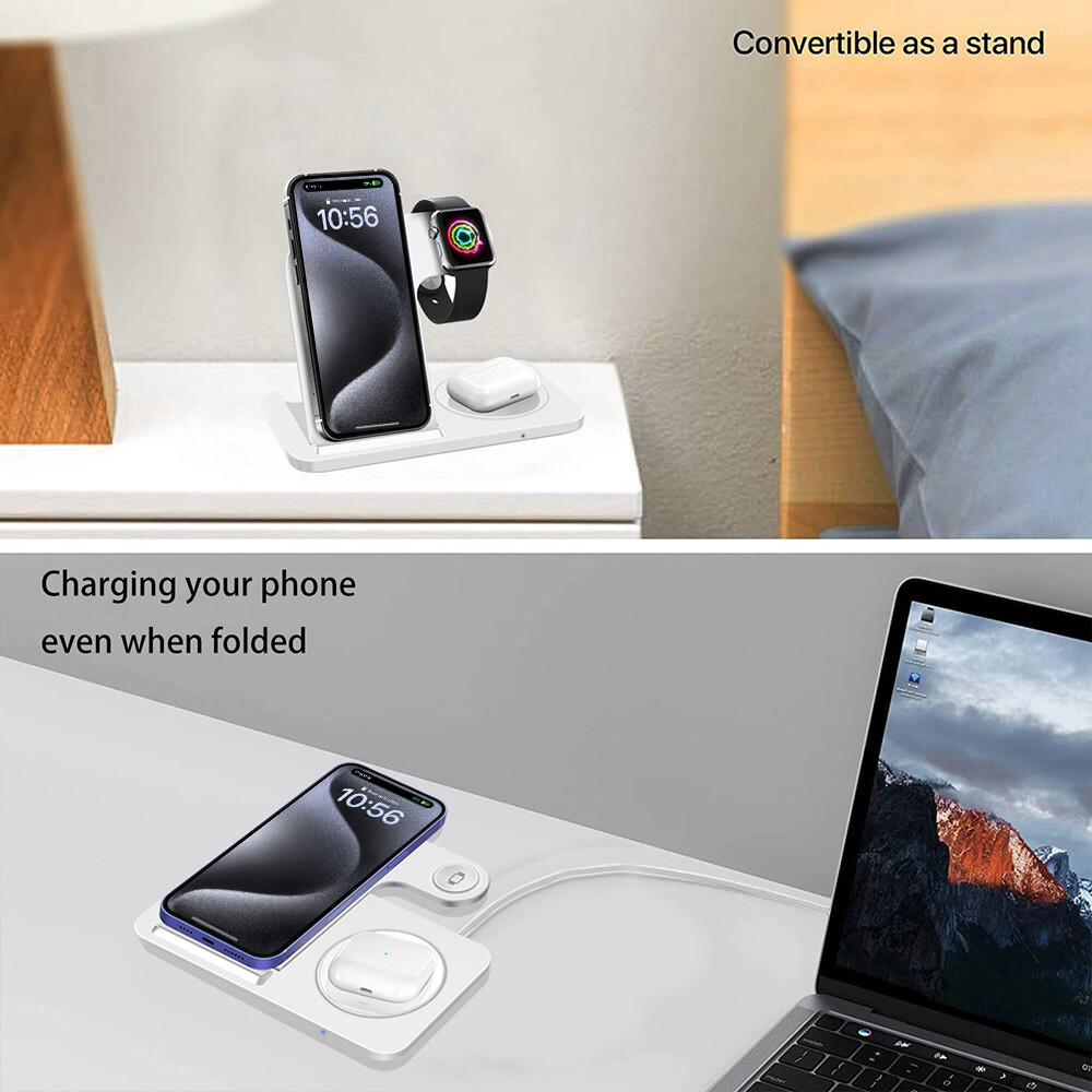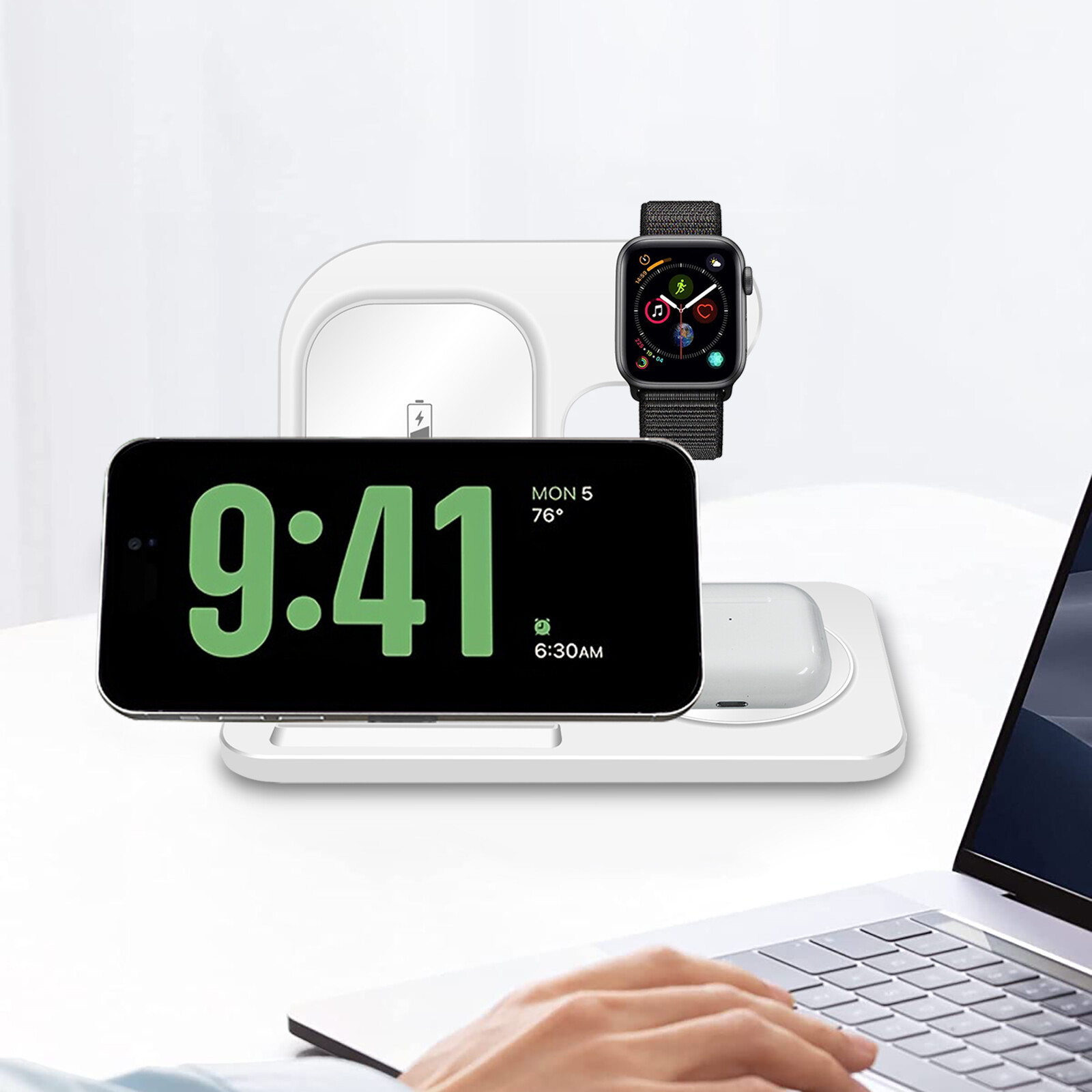 1 x 3 in 1 Kabelloses Ladegerät (ohne Adapter). Smartwatch Position kompatibel mit Die Ladestation der Uhr ist nur mit der Apple Watch kompatibel. Perfekt für den Einsatz auf Reisen oder auf Geschäftsreise.