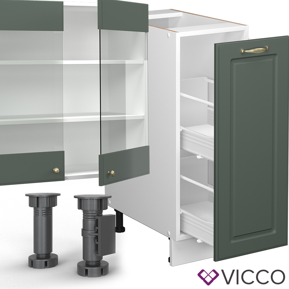 Die Fronten sind im klassisch modernen Landhausstil gehalten. Der Farbton der Fronten ist ideal auf die jeweilige Korpusfarbe abgestimmt. Fronten: Grün, matt / Anthrazit, matt. Der modulare Aufbau der Küche ermöglicht es auch, sie individuell selbst zu gestalten.